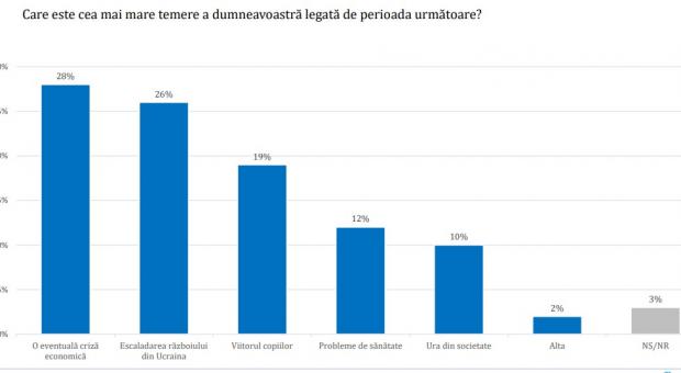 Întrebați care este cea mai mare temere pentru perioada următoare, 28% dintre români au indicat o posibilă criză economică.