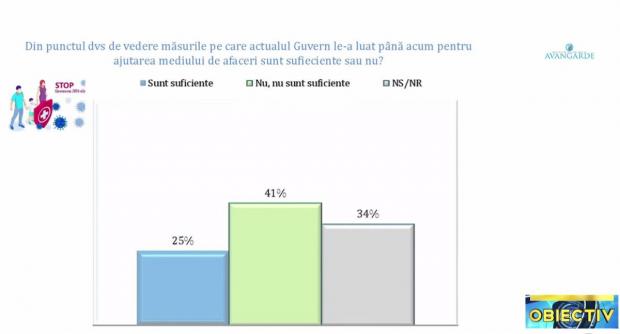 La întrebarea referitoare la măsurile luate de Guvernul PNL până în acest moment pentru ajutarea mediului de afaceri, cei mai mulți români (41%) sunt de părere că acestea nu sunt suficiente, în timp ce 25% au spus că sunt suficiente.