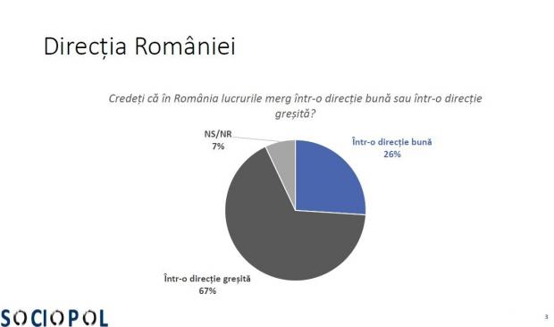 Conform studiului SOCIOPOL, majoritatea românilor este de părere că România nu se îndreaptă într-o direcţie bună. Mai exact, 67% aceştia consideră că România se îndreaptă în direcţia greşită. 26% consideră că suntem pe drumul cel bun.