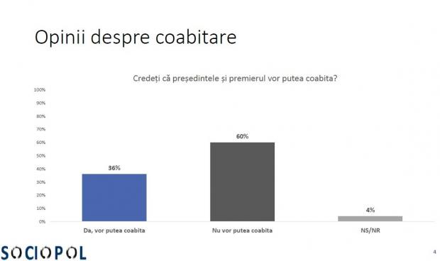 La întrebarea "Credeţi că preşedintele şi premierul vor putea coabita?", românii s-au arătat destul de sceptici. 60% dintre aceştia consideră că cei doi nu vor putea coabita, în timp ce doar 36% consideră că este posibilă coabitarea.
