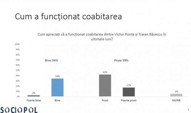 Când vine vorba de coabitarea dintre Victor Ponta şi Traian Băsescu în ultimele luni, 59% dintre români au percept coabitarea ca fiind "proastă", în timp ce 36% au văzut coabitarea ca fiind "bună".