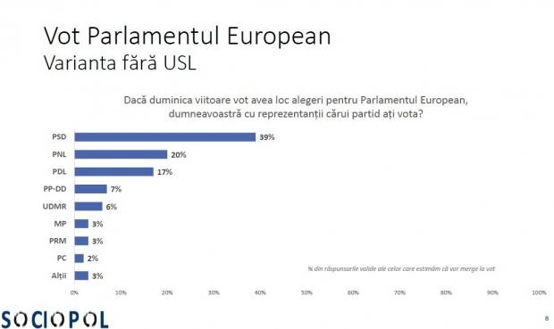 În fine, dacă duminica viitoare ar avea loc alegeri europarlamentare, dintre cei care ar merge la vot, 39% ar vota cu PSD, 20% cu PNL, 17% cu PDL.