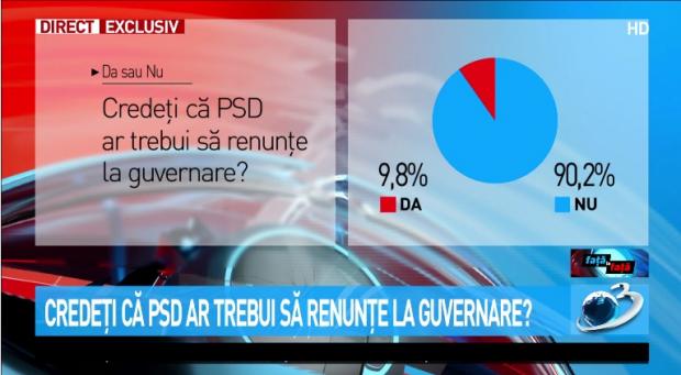 Telespectatorii Antena 3 au votat astfel: 9,8% au răspuns DA și 90,2% au răspuns NU.