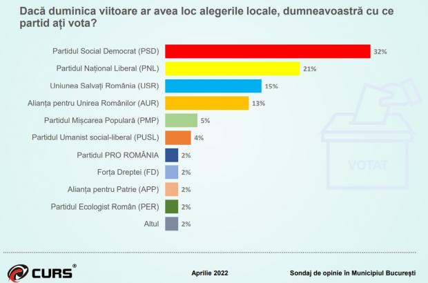 Centrul de Sociologie Urbană şi Regională (CURS) a realizat un sondaj de opinie la nivelul municipiului Bucureşti, în perioada 9-19 aprilie 2022.