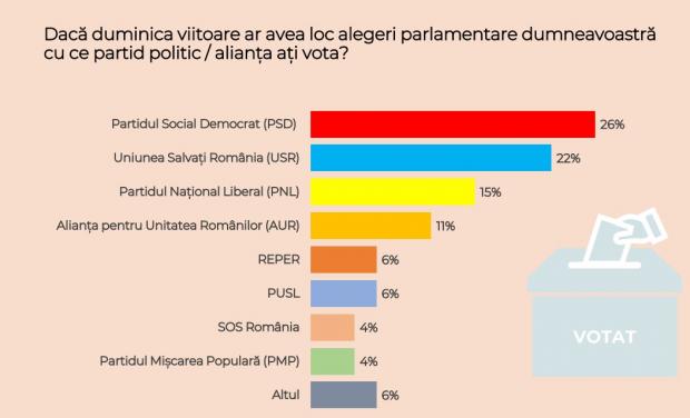 Dacă duminica viitoare ar avea loc alegeri parlamentare, bucureștenii ar vota în felul următor: PSD ar obține 26%, USR ar obține 22%, PNL 15%, cei de la AUR ar obține aproximativ 11%, în timp ce REPER și pe USL ar reuși să obțină 6%, deci să treacă pragul de cinci procente și să intre în Parlament.