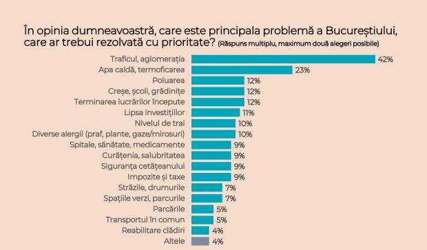 La întrebarea „care este principala problemă a Bucureștiului”, oamenii au at următoarele răspunsuri: traficul, lipsa apei calde, problema poluării, faptul că nu există creșe, școli sau grădinițe.