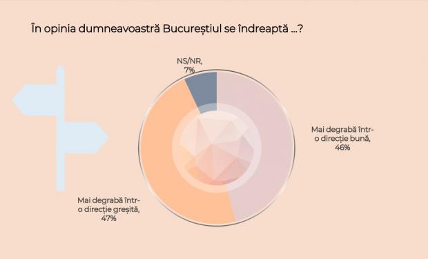 Potrivit sondajului CURS, 47% dintre respondenți spun că Bucureștiul se îndreaătă într-o direcție greșită, 46% spun că se îndreaptă, mai degrabă, spre o direcție bună, iar 7% au decis să nu răspundă.