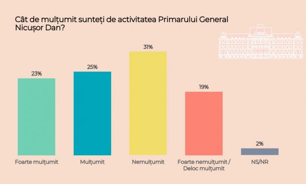În ceea ce privește activitatea primarului general Nicușor Dan, 31% dintre bucureșteni s-au arătat nemulțumiți și 19% foarte nemulțumiți sau deloc mulțumiți. Pe de altă parte, 23% au răspuns că sunt foarte mulțumiți de edil și 25% au spus că sunt mulțumiți de activitatea sa la PMB.