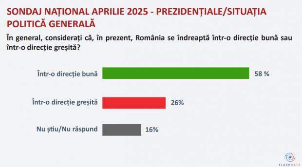 58% dintre români consideră că România se îndreaptă într-o direcție bună, în timp ce 26% apreciază că, dimpotrivă, direcția este greșită, arată rezultatele sondajului. 16% dintre românii chestionați nu au răspuns la această chestiune.