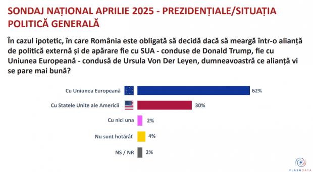 62% dintre români ar alege continuarea unei alianțe de politică externă și de apărare alături de Uniunea Europeană și doar 30% ar alege SUA, în ipoteza în care România ar fi obligată să facă această alegere, arată rezultatele unui sondaj Flashdata, realizat în perioada 10-12 aprilie.