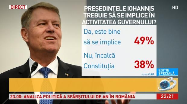 Potrivit sondajului organizat la scurt timp după alegerile prezidenţiale, 49% dintre respondenţi sunt de părere că implicarea lui Klaus Iohannis în activitatea Guvernului este un lucru bun, în timp ce 38% afirmă că preşedintele încalcă Constituţia.
