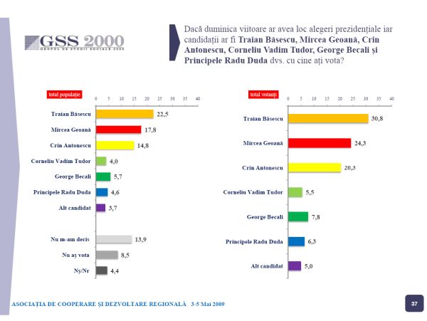 La capitolul alegeri prezidenţiale, actualul preşedinte Traian Băsescu continuă să conducă în preferinţele românilor, urmat însă destul de aproape de preşedintele PSD, Mircea Geoană. Pe locul trei se află preşedintele PNL, Crin Antonescu. Astfel, la întrebarea Dacă duminica viitoare ar avea loc alegeri prezidenţiale, cu cine aţi vota? - sondajul prezintă următoarele procente: Traian Băsescu - 30,8%, Mircea Geoană - 24,3%, Crin Antonescu - 20,3%, George Becali - 7,8%, Radu Duda - 6,3%, Corneliu Vadim Tudor 5,5%. Totuşi, şi acest clasament poate suferi schimbări importante, având în vedere că proporţia indecişilor este de 26,9%.