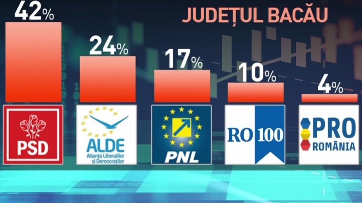 1. Județul Bacău - PSD - 42%, ALDE - 24%, PNL - 17%, Ro 100 - 10%