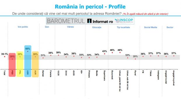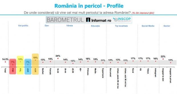 Votanții PSD sunt de părere că pericolul vine din afara țării, în timp ce votanții AUR, persoanele între 18 și 29 de ani și angajații la stat consideră într-o măsură mai mare decât restul populației că pericolul vine din interiorul țării. Cred că pericolul vine în egală măsură din afară și din interior mai ales: persoanele cu studii superioare, votanții USR și locuitorii din București și din urbanul mare, mai arată barometrul INSCOP.