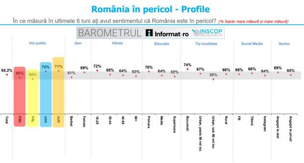 Aproape două treimi dintre români au avut, în ultimele șase luni, sentimentul că România este în pericol, arată a doua ediție a Barometrului Informat.ro realizat de INSCOP Research în perioada 20–26 iunie. Votanții USR și AUR, tinerii între 18 și 29 de ani și locuitorii din București sunt categoriile care au resimțit cel mai intens acest sentiment, în mare și foarte mare măsură.