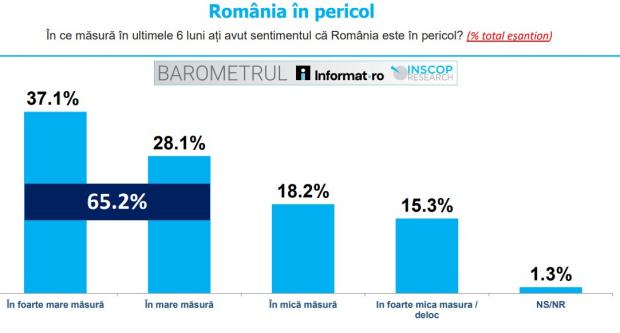 Sondajul arată că 37.1% dintre români spun că în ultimele 6 luni au avut sentimentul că România este în pericol în foarte mare măsură, 28.1% în mare măsură, 18.2% în mică măsură, iar 15.3% în foarte mică măsură/deloc. 1.3% nu știu sau nu răspund.