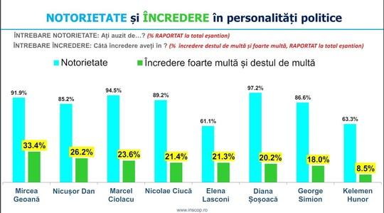 Secretarul general adjunct al NATO, Mircea Geoană, ocupă primul loc în topul încrederii românilor în personalități politice, conform unui sondaj realizat de INSCOP la comanda News.ro. Pe locul al doilea se situează Nicușor Dan, urmat de Marcel Ciolacu și Nicolae Ciucă. În clasamentul notorietății, Diana Șoșoacă se află pe prima poziție, urmată de Marcel Ciolacu, Mircea Geoană și Nicolae Ciucă. Ea este de asemenea pe primul loc în topul neîncrederii, cu Marcel Ciolacu pe locul doi și George Simion pe locul trei.