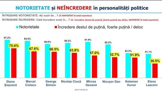 În ceea ce privește notorietatea, topul este condus de Diana Șoșoacă cu 97,2%, urmată de Marcel Ciolacu cu 94,5%, Mircea Geoană cu 91,9%, Nicolae Ciucă cu 89,2%, George Simion cu 86,6%, Nicușor Dan cu 85,2%, Kelemen Hunor cu 63,3% și Elena Lasconi cu 61,1%.