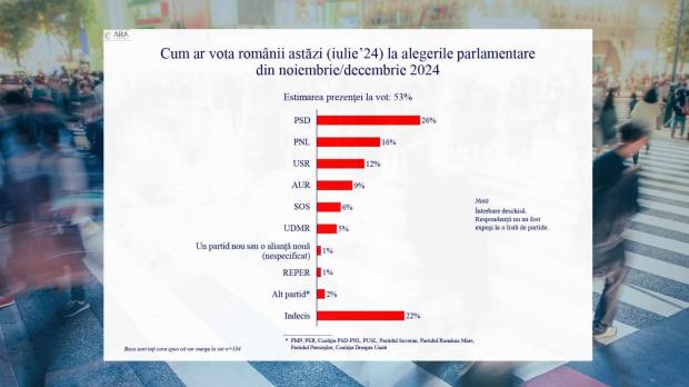 AUR ar câștiga 9% din voturi, SOS - 6%, iar UDMR - 5%.