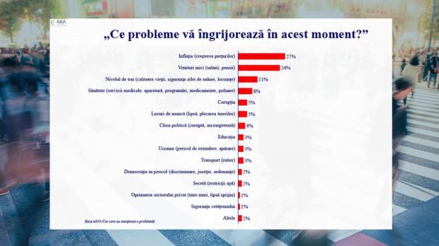 Întrebați și ce probleme îi îngrijorează în prezent, cei chestionați au răspuns: inflația - 27%, venituri mici - 24%, nivelul de trai - 11%.