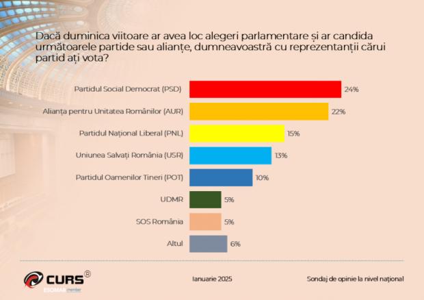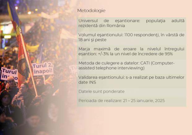 Sondajul Curs a fost realizat pe un eșantion reprezentativ de 1100 de persoane cu vârsta de 18 ani și peste, are o marjă de eroare de +/- 3% , în perioada 21-25 ianuarie 2025, prin interviu telefonic.