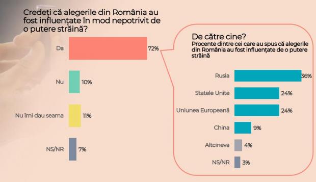 Dintre participanții la sondaj, 72% s-au declarat convinși de faptul că alegerile din România au fost influențate în mod nepotrivit de o putere străină, iar dintre acești 72% dintre respondenți, 36% au indicat drept responsabil Rusia (36%), SUA (24%), UE (24%), China (9%), altcineva(4%) în timp ce 3% au optat pentru "nu știu / nu răspund".