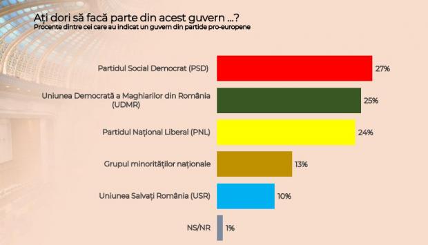 UDMR, indicat de 25% dintre pro-europeni drept formațiune care să facă parte din Guvern. USR, indicat de doar 10%