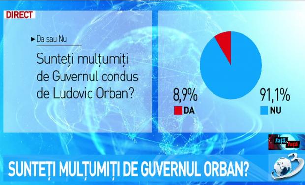 UPDATE 20.50 - 8,9% dintre telespectatorii Antena 3 susțin că sunt mulțumiți de Guvernul condus de Ludovic Orban, în timp ce 91,1% se declară nemulțumiți.