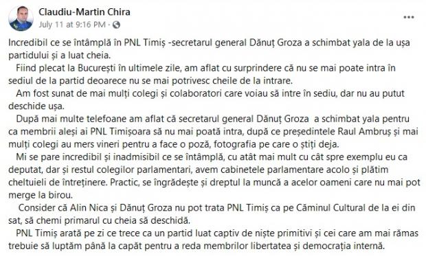 Am fost sunat de mai mulți colegi și colaboratori care voiau să intre în sediu, dar nu au putut deschide ușa. După mai multe telefoane am aflat că secretarul general Dănuț Groza a schimbat yala pentru ca membrii aleși ai PNL Timișoara să nu mai poată intra, după ce președintele Raul Ambruș și mai mulți colegi au mers vineri pentru a face o poză, fotografia pe care o știți deja", a scris Claudiu Chira, pe Facebook.