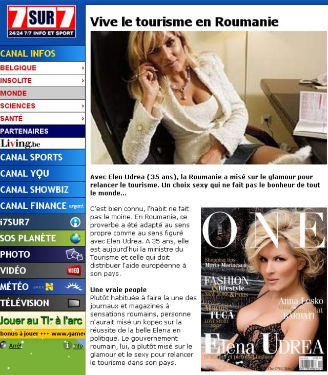 Într-un articol cu titlul "Vive le tourisme en Roumanie!", însoţit de câteva fotografii provocatoare cu ministrul român, jurnaliştii vorbesc despre decizia de numire a Elenei Udrea în Guvern, precum şi despre legăturile dintre politică şi afaceri a familiei acesteia.