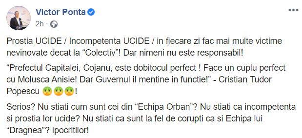 ”Serios? Nu știați cum sunt cei din “Echipa Orban”? Nu știati că incompetenta si prostia lor ucide? Nu stiati ca sunt la fel de corupti ca si Echipa lui “Dragnea”? Ipocritilor!”, încheie postarea liderul Pro România, Victor Ponta.