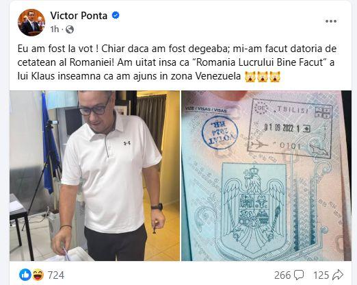 "Eu am fost la vot ! Chiar dacă am fost degeaba; mi-am făcut datoria de cetățean al României! Am uitat însă că “România Lucrului Bine Făcut” a lui Klaus înseamnă că am ajuns în zona Venezuela", a scris politicianul pe Facebook.