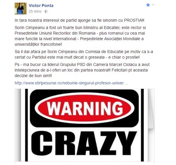 Victor Ponta comentează, într-un text postat miercuri pe Facebook, decizia ALDE de a-l exclude pe fostul ministru al educației Sorin Cîmpeanu din Comisia de Educație.
