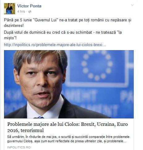 Victor Ponta face referire în postare la subiectul unui articol publicat de inpolitics.ro în care se arată că problemele care îl preocupă în acest moment pe premierul Dacian Cioloș nu sunt cele care s-ar impune să se regăsească în agenda sa.