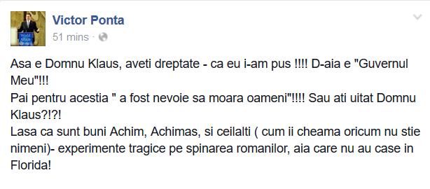 Victor Ponta a comentat, miercuri după-amiază, pe Facebook declarațiile făcute de președintele Klaus Iohannis la adresa guvernului tehnocrat condus de Dacian Cioloș.