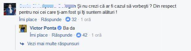 ”Şi nu crezi că ar fi cazul să vorbeşti ? Din respect pentru noi cei care ţi-am fost şi îţi suntem alături”, îi scrie cineva. Răspunsul lui Victor Ponta fiind ”Ba da”.