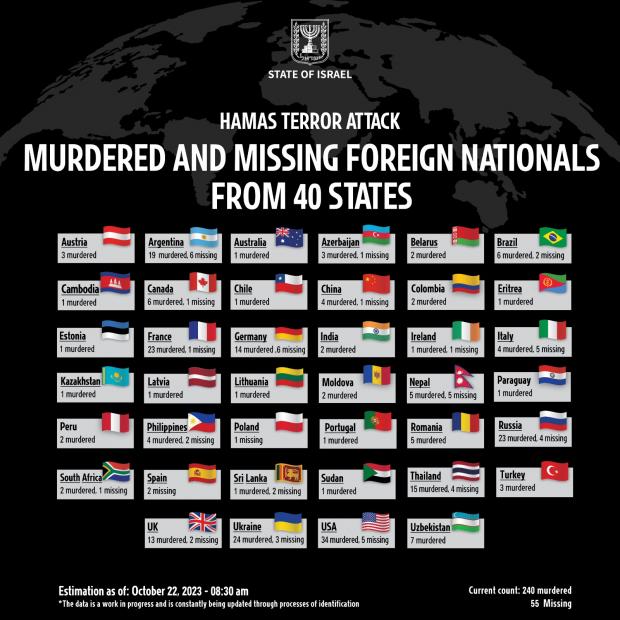 Colegii mei de la Ambasada României din Tel Aviv, de la Consulatul General al României la Haifa, sunt în legătură cu autoritățile israeliene, cum presupun că sunt și alte state care, din păcate, au victime în Israel, ca urmare a atacurilor din 6 spre 7 octombrie.