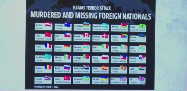 Vă voi arăta acum o hartă cu toate drapelele și o să numesc câteva țări, printre care Austria, Australia, Azerbaijan, Argentina, Belarus, Brazilia, China, Chile, Canada, Danemarca, Eritreea, Estonia, Franța, Germania, Ungaria, Italia, Irlanda, India, Kazakhstan, Mexic, Portugalia, Polonia, Filipine, Panama, România, Rusia, Africa de Sud, Spania, Sri Lanka, Sudan, Thailanda, Turcia, Uzbekistan, Ucraina, Statele Unite și Regatul Unit, ale căror cetățeni au fost afectați, însă datele trebuie reconfirmate”, a declarat, astăzi, președintele Israelului.