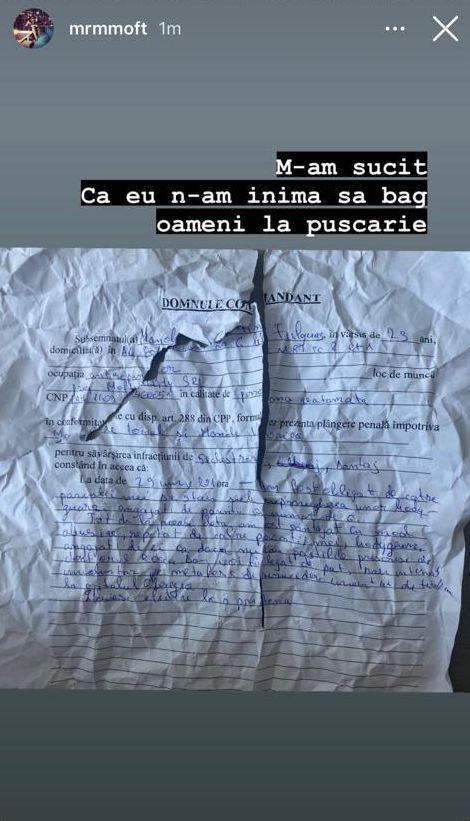 "M-am sucit, că eu n-am inimă să bag oameni la puşcărie", a scris Fulgy pe o reţea de socializare, acolo unde a postat şi o fotografie cu o cerere ruptă.