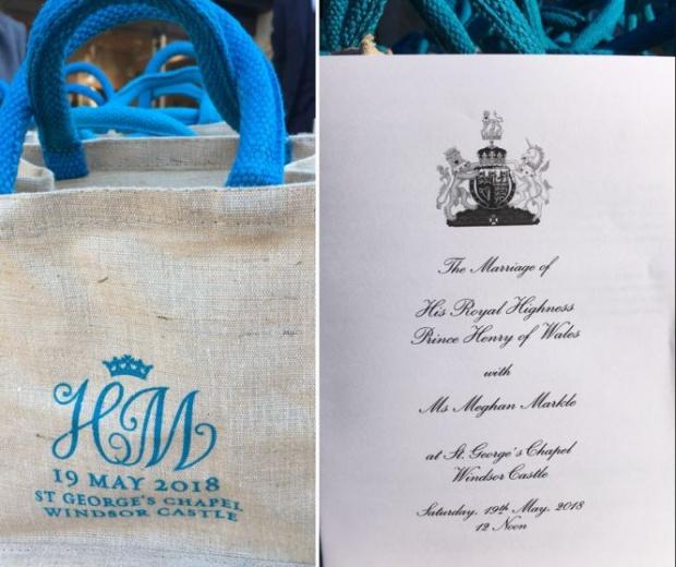 Pe plasele din pânză erau inscripționate inițialele mirilor, data nunții și locul unde a avut loc ceremonia. Printre cadouri s-au numărat ciocolată, apă, prăjituri, un cupon de 20% reducere la magazinul Castelului Windsor și un magnet pe care scria „Nunta lui Harry cu Meghan”.