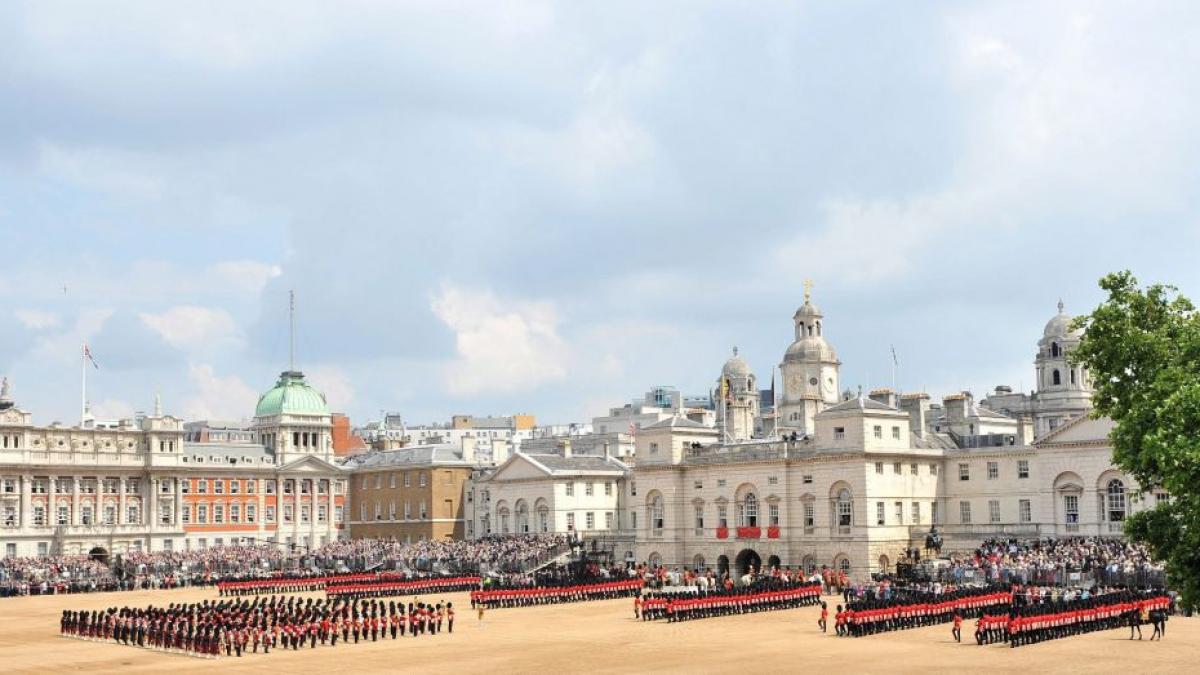 Ceremonia a fost deschisă de alaiul regal, ce a venit la Palatul Buckingham. Trăsura în care se aflau Regina şi prinţul Consort Philip a fost escortată călare de Prinţul William şi tatăl său, Charles, costumaţi cu uniforme. A urmat apoi trăsura care-i avea ca pasageri pe Ducesa de Cambridge, Prinţul Harry şi Camilla Parker, soţia lui Charles. Imediat, trupele au fost gata de paradă.