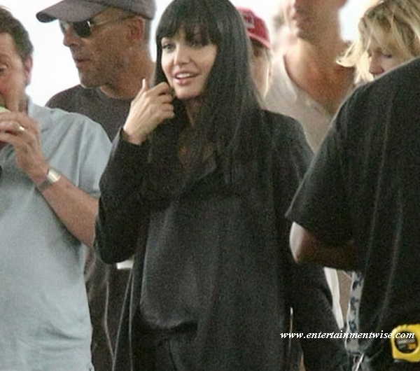 Fotografii au surprins imagini cu Angelina, pe platourile de filmare ale producţiei ?Salt?. Actriţa este îmbrăcată cu o bluză neagră, largă şi pare a fi însărcinată.
