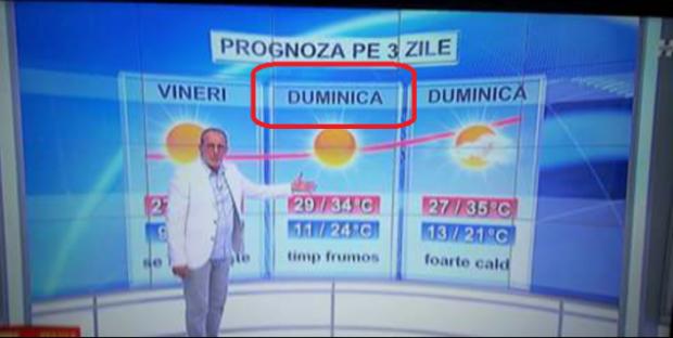 Florin Busuioc prezintă Vremea la ProTV de ani de zile, chiar după știrile de la ora 19.00 prezentate de Andreea Esca. Însă joi seară Busu a avut o problemă tehnică și astfel când a vrut să detalieze prognoza pentru weekend toți au avut surpriza să constate că weekend-ul ce vine va fi format din două dumninici. Prezentatorul a prezentat liniștit rubrica fără să schițeze vreun moment că ar fi observat vreo eroare.