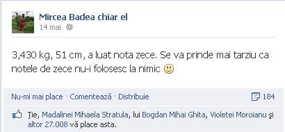 Miercuri seară, Carmen Brumă a dat naştere unui băieţel de 3,430 de kilograme, care a primit nota 10 la naştere, potrivit postării de pe Facebook a fericitului tătic, Mircea Badea.