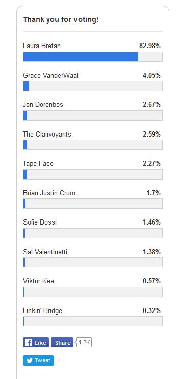 LAURA BRETAN CÂȘTIGĂTOR AMERICA'S GOT TALENT. Potrivit acestui sondaj, Laura Bretan este creditată cu peste 80% din șanse să câștige America’s Got Talent.