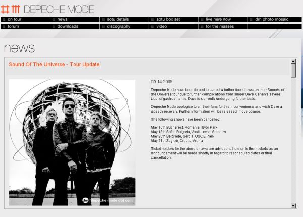 Veteranii electro-pop de la Depeche Mode vor concerta din nou la Bucureşti pe 16 mai în Parcul Izvor. Aceasta va fi cea de-a doua apariţie a formaţiei la Bucureşti, după concertul din iulie 2006, pe Stadionul Naţional din capitală, când s-au adunat circa 45.000 de fani. Turneul va cuprinde 28 de oraşe din 22 de ţări şi va debuta în Israel, pe 10 mai 2009.