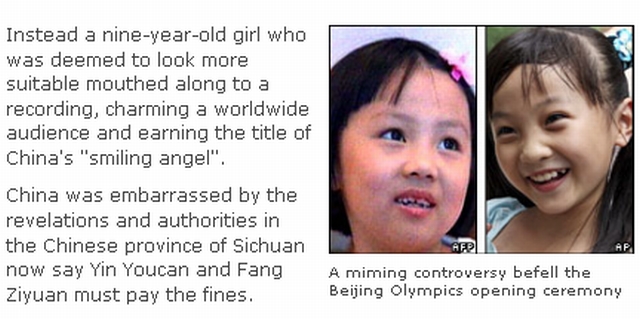 Playback-ul a fost interzis în China după ce s-a a ieşit la iveală faptul că o fetiţă a mimat cântecul pe care l-a interpretat la ceremonia de deschidere a Jocurilor Olimpice de la Beijing. Adevărata cântăreaţă avea dinţii cariaţi, ea nefiind considerată suficient de frumoasă pentru o apariţie publică.