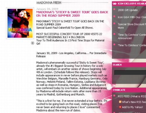 Cel mai recent album al artistei, Hard Candy, dar şi cântece din trecutul ei glorios, precum Vogue, Hung Up şi Ray of Light, vor încânta publicul din Milan, Barcelona, Munchen, Oslo, Helsinki, Hamburg, Praga şi Varşovia, locaţiile exacte pentru Bulgaria, Ungaria, Rusia, România şi Serbia urmând să fie stabilite ulterior.