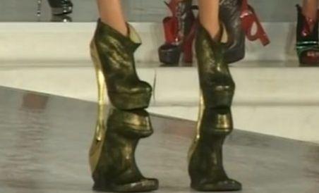 Creatorul de modă Mihai Albu a şocat sâmbătă seară la Fashion Summer Festival. A adus în faţa publicului cea mai îndrăzneaţă creaţie a sa: pantofii cu toc de? 37 de centimetri! Manechinul care a purtat încălţămintea trăsnită a designerului a ajuns să privească lumea de la peste 2 metri înălţime.