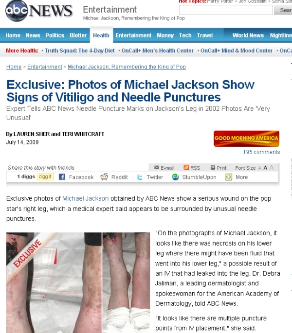 Debra Jaliman a calificat drept neobişnuit faptul că perfuziile au fost introduse în picior. ?În cariera mea de 22 de ani, nu am văzut pe nimeni punând o perfuzie în picior. Perfuziile se pun în braţe. Există, totuşi, cazuri în care medicii sunt obligaţi să caute şi alte locuri în care să pună perfuzia?, a declarat medicul.